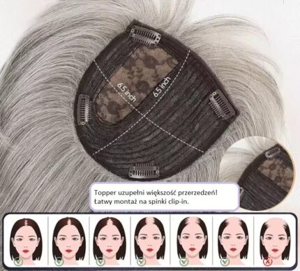 Do noszenia toppera musisz mieć pewną ilość włosów aby była możliwość wpięcia spinek clip in. Za mała ilość włosów spowoduje spadanie lub przesuwanie się tupetu. W takiej sytuacji zainwestuj w perukę!