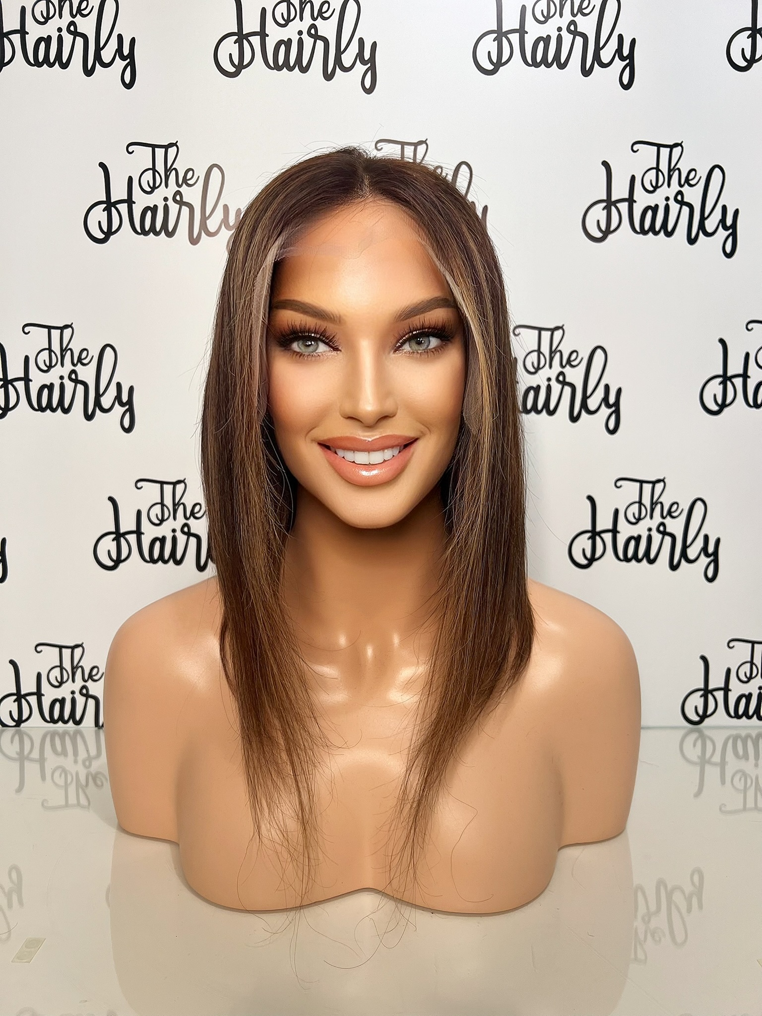 Peruka naturalna Janice front lace z włosów europejskich, długość 40cm, średni brąz z pasemkami