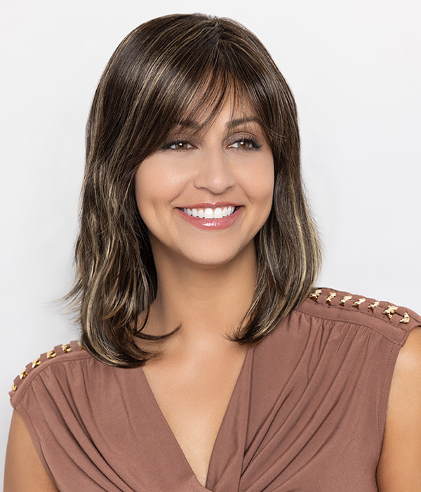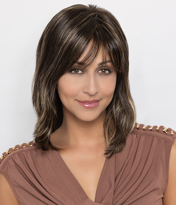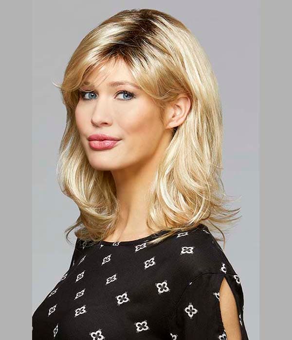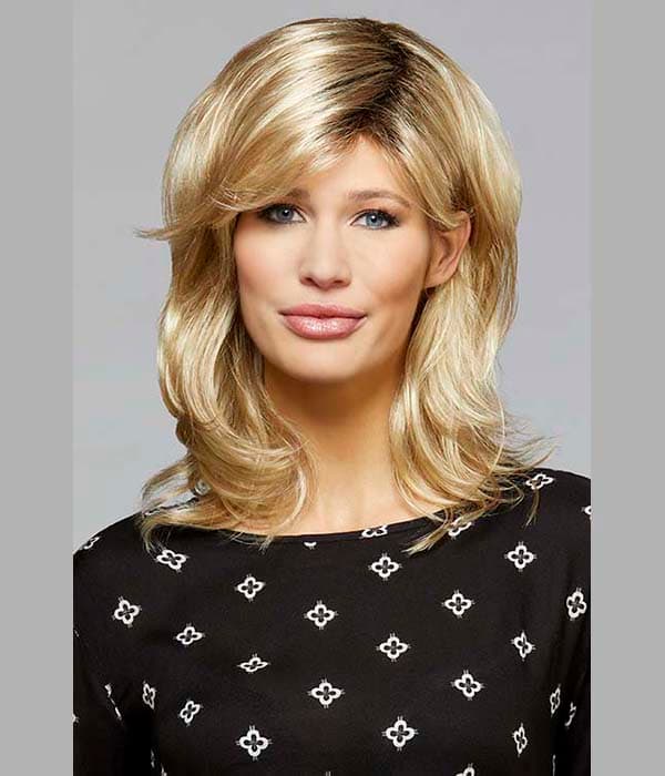 Piękna peruka sięgająca delikatnie poniżej ramion z cieniowanymi, miękkimi falami.