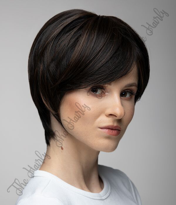 Peruka syntetyczna w kolorze głębokiego brązu posiada nowoczesne krótkie strzyżenie. Lekkie cieniowanie podkreśla rysy twarzy a delikatna grzywka dodaje fryzurze naturalności. Możliwa stylizacja do 160 stopni. Idealna dla Pań poszukujących nowoczesnych fryzur. Czepek odpowiedni zarówno dla osób, które utraciły włosy, ale też tych które chcą zmienić swój wygląd.