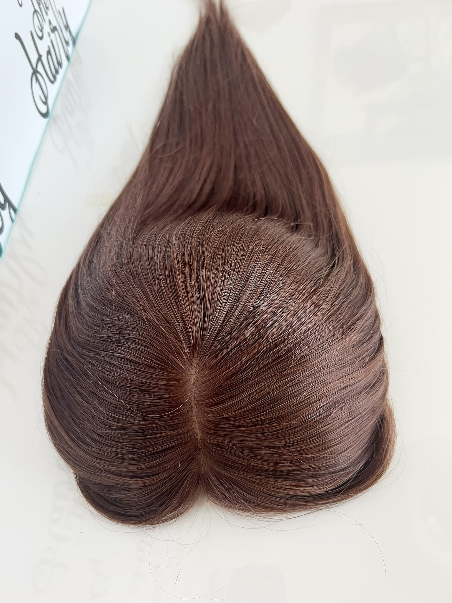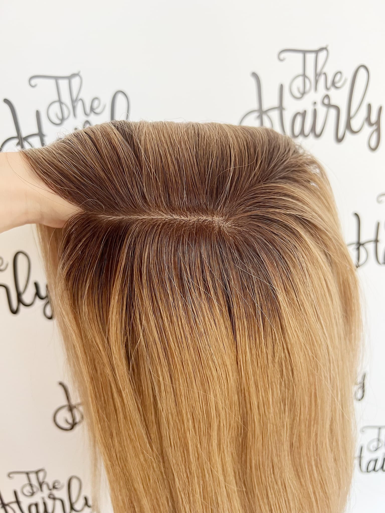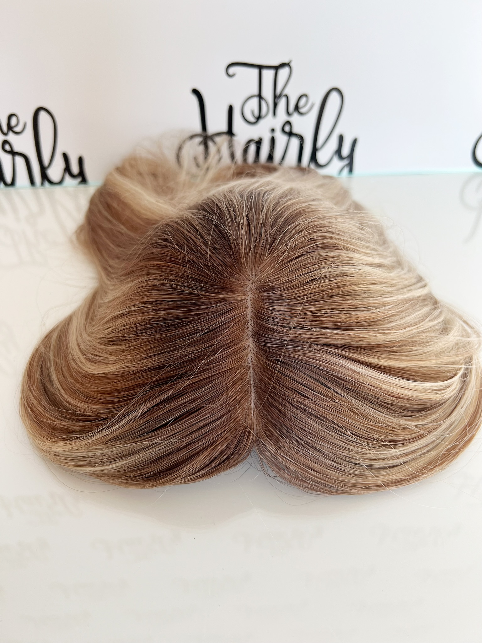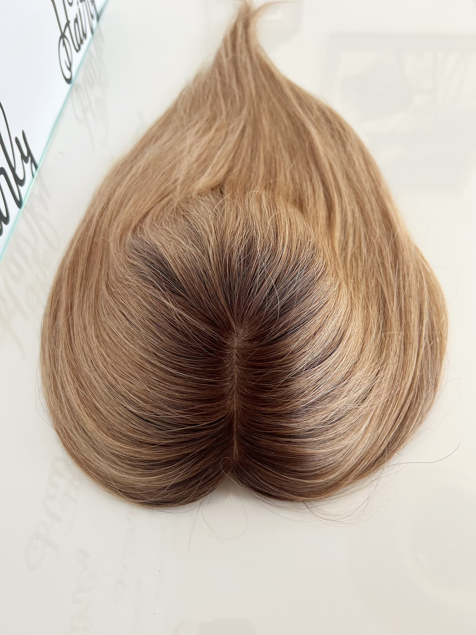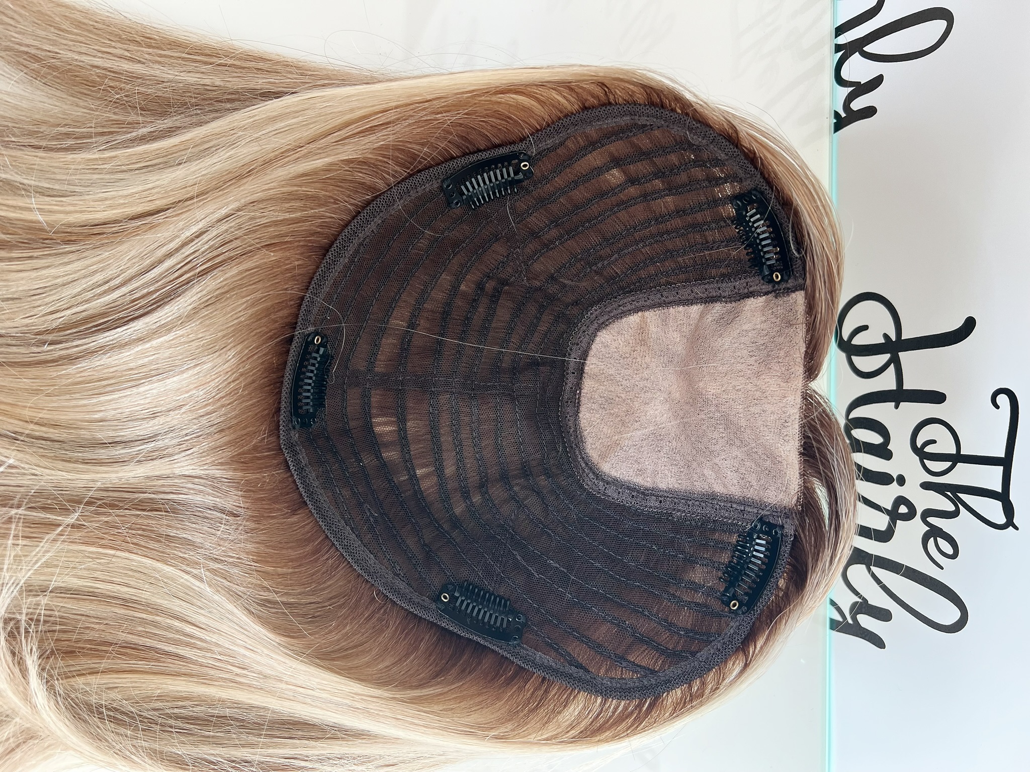 Topper naturalny mono top wykonany w 100% z włosów naturalnych, zawierający mikroskórę w obszarze przedziałka. Montowany na 5 spinek clip-in, długość włosów 41-45cm. Jeśli potrzebujesz więcej spinek oczywiście możesz je doszyć samodzielnie, konstrukcja bazy na to pozwala.
