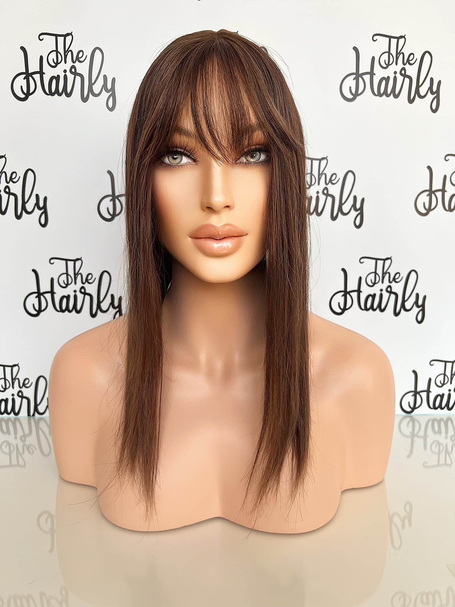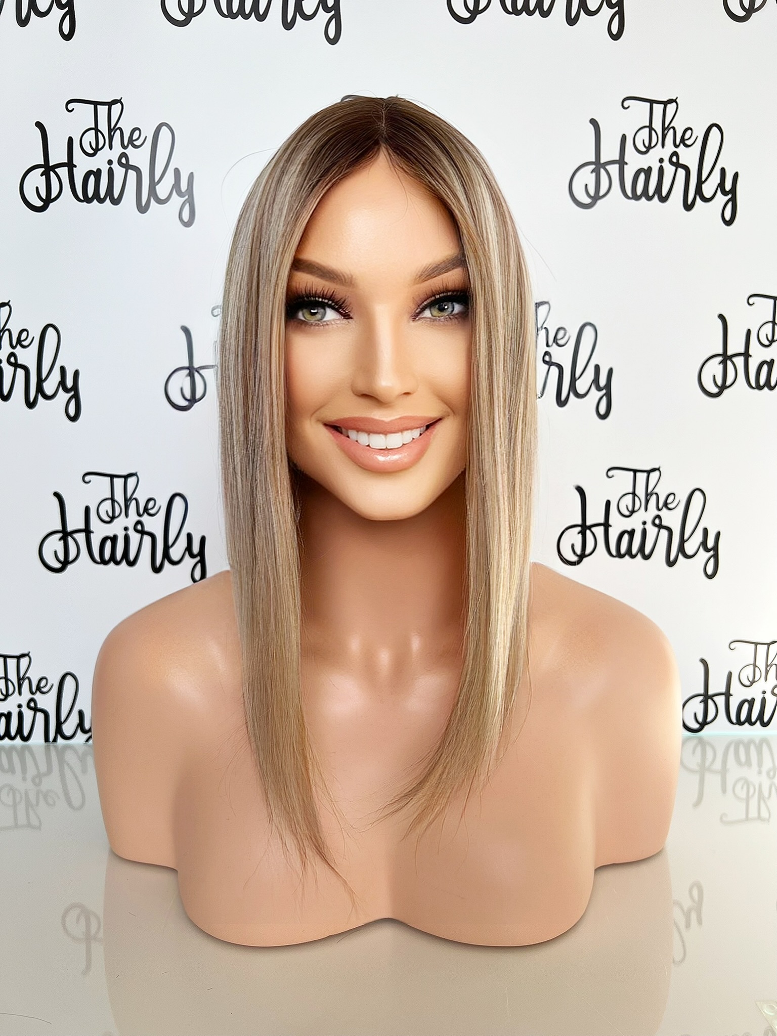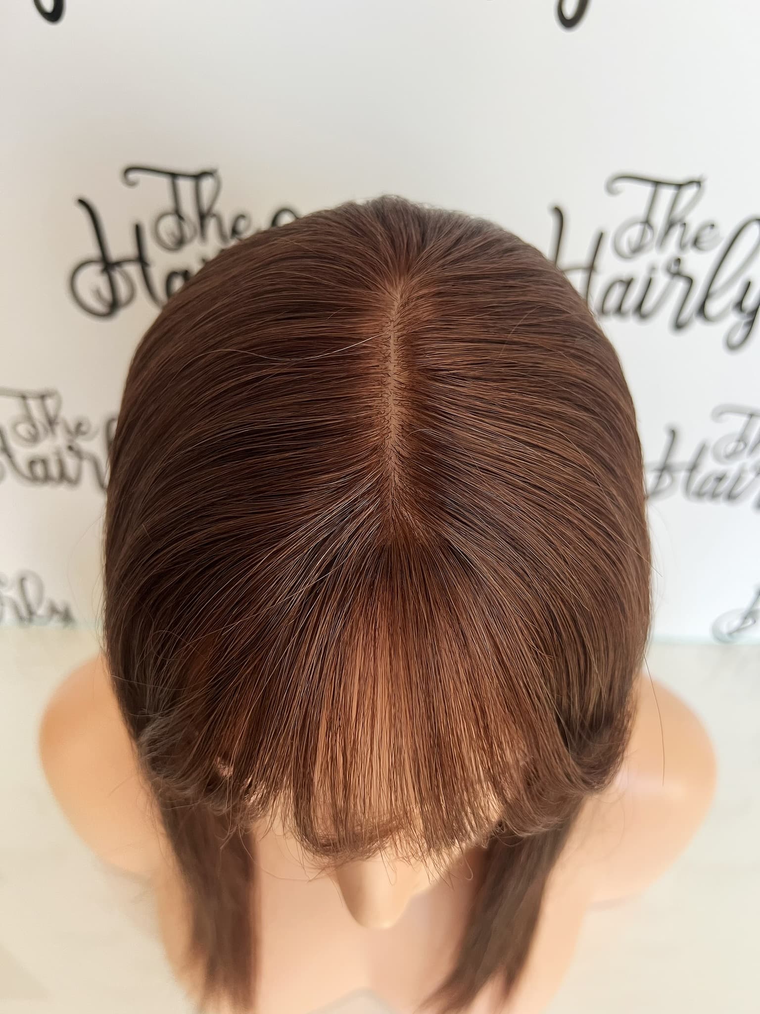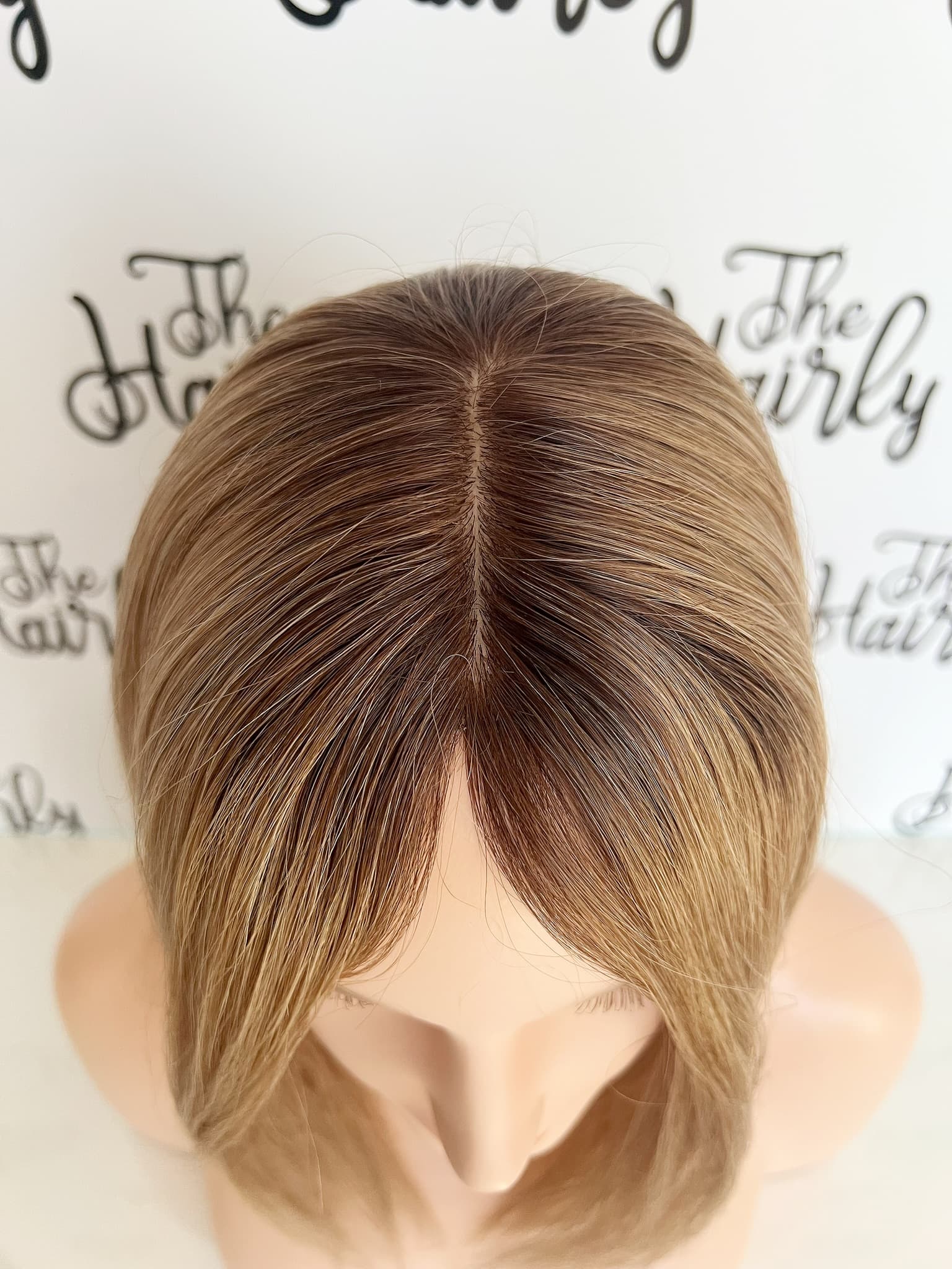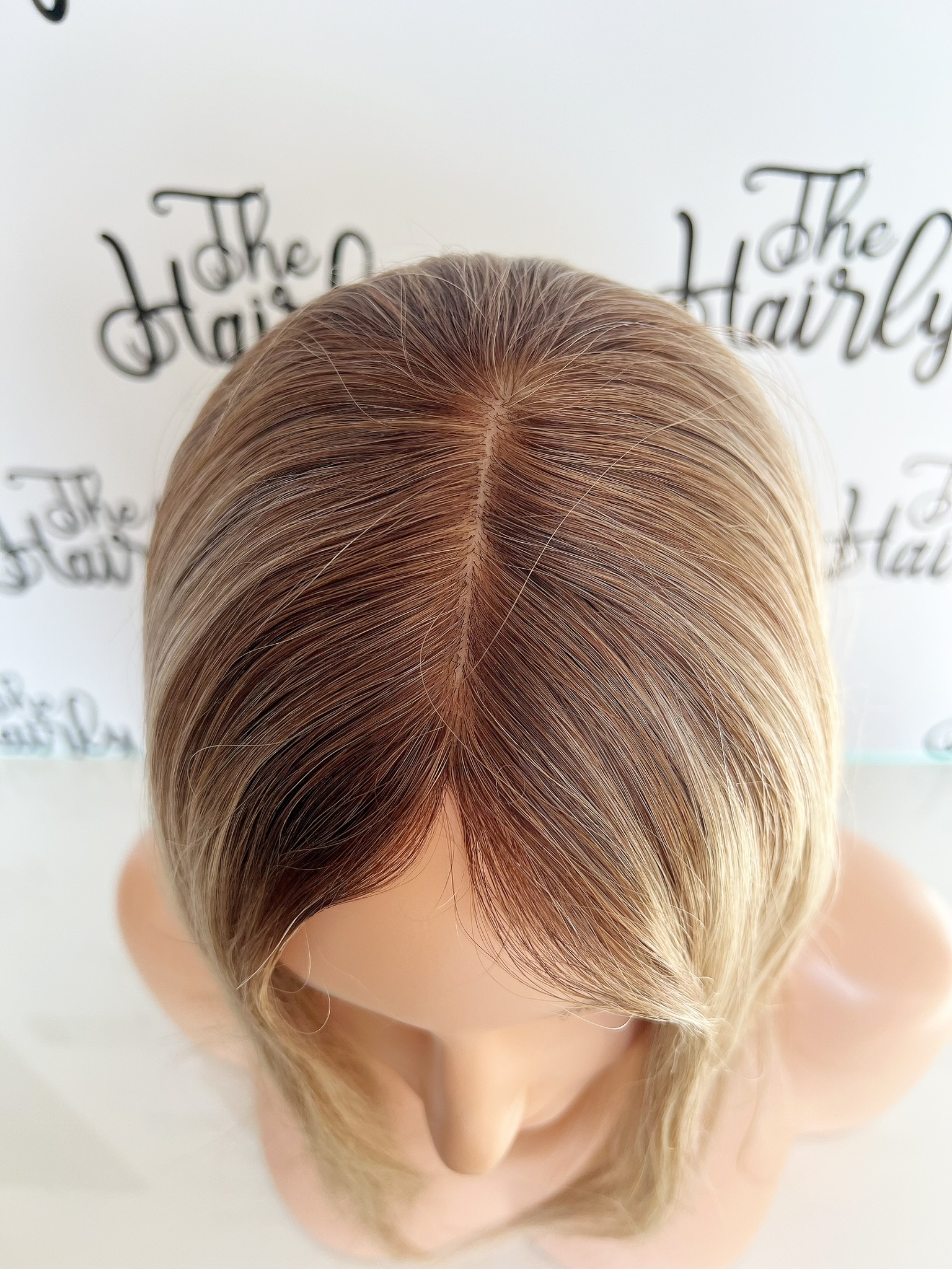 Topper naturalny mono top wykonany w 100% z włosów naturalnych, zawierający mikroskórę w obszarze przedziałka. Montowany na 5 spinek clip-in, długość włosów 41-45cm. Jeśli potrzebujesz więcej spinek oczywiście możesz je doszyć samodzielnie, konstrukcja bazy na to pozwala.