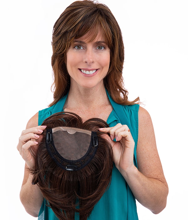 Tupet syntetyczny z kolekcji Style Unveiled marki WigUSA jest wykonany z termoodpornych włosów które możesz prostować i kręcić do 180 stopni. Baza ma wymiar 14 na 15cm. Jest szyta ręcznie i aplikowana na 3 spinki clip-in. Dodatkowo na przodzie jest silikonowa warstwa która może przylegać do skóry lub możesz doszyć do niej spinkę. Tupet jest bardzo lekki i idealnie nadaje się do średniego zagęszczenia. Jeśli natomiast masz gołe obszary na bokach lub z tyłu głowy to nie będzie to odpowiedni produkt dla Ciebie.